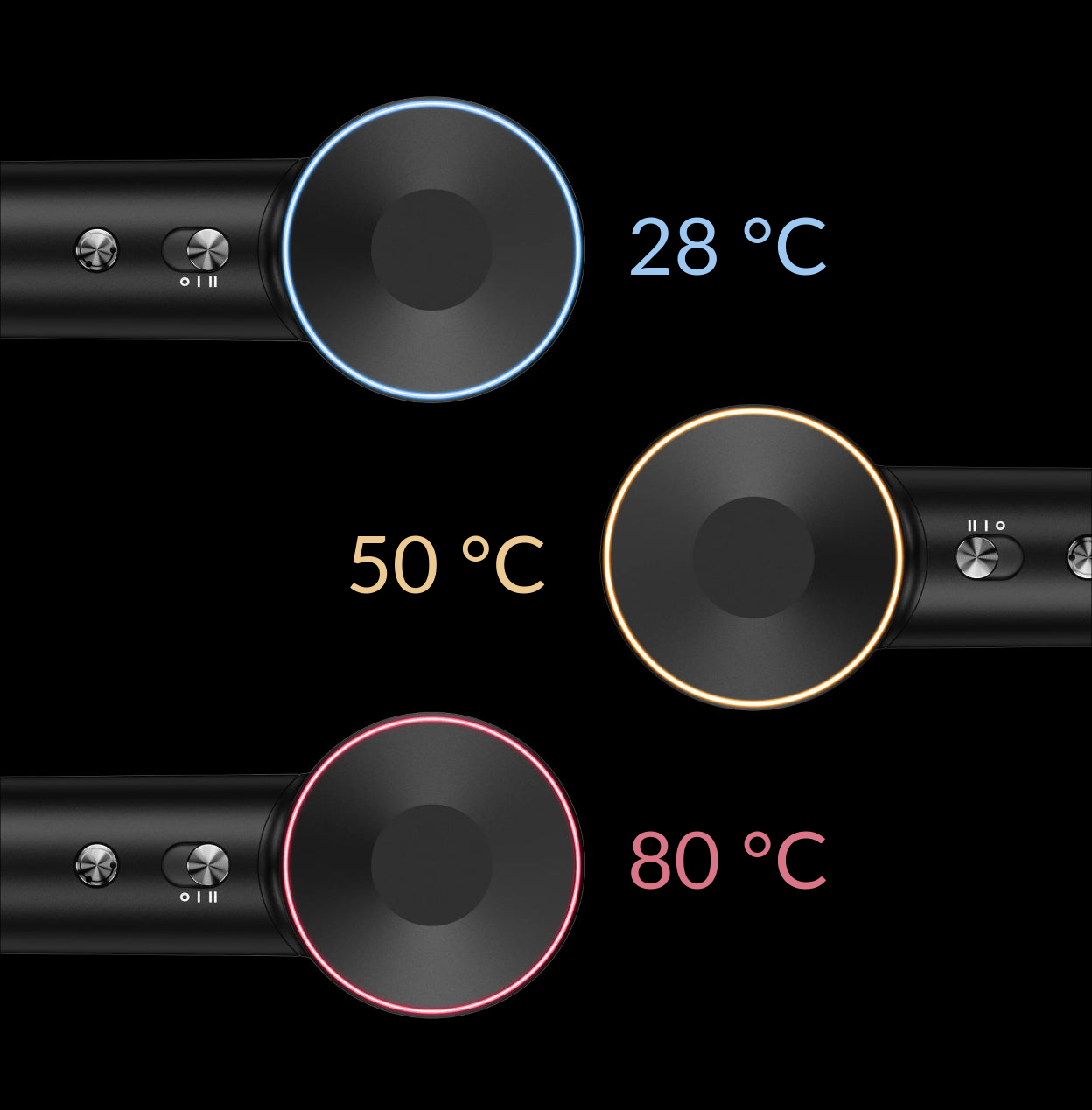 Na taj način možete održavati temperaturu pod kontrolom kako se vaša kosa i vlasište ne bi oštetili. Indikatorski prsten prikazuje 3 – 4 boje.